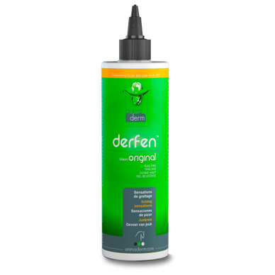 Animaderm's Derfen Original Lotion is a favorite among riders and horse enthusiasts for its effective insect repellent, skin-care properties, and ease of application. This lotion offers long-lasting protection against biting insects in particularly sensitive areas, such as the head, mane, and flank.