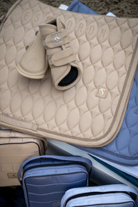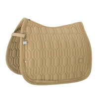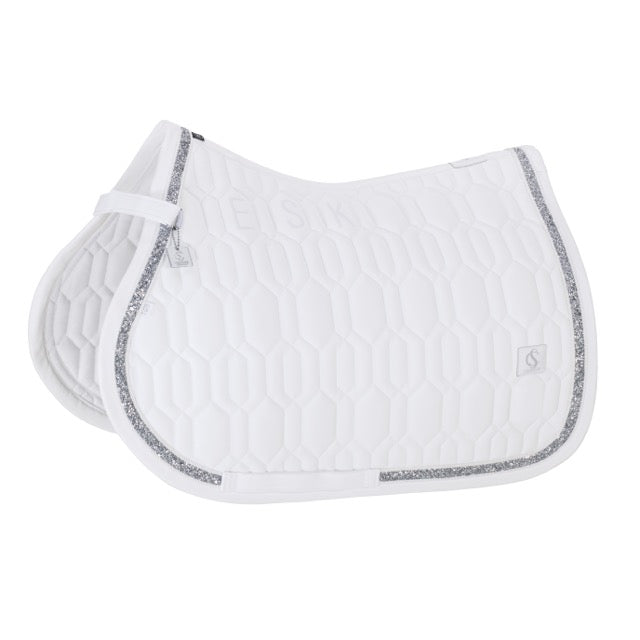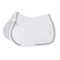 De softshell bovenstof voelt soepel aan, is vuilafstotend en behoudt langdurig zijn vorm. De subtiele jewel-bies langs de rand geeft het zadeldek een luxueuze, sprankelende touch die mooi tot zijn recht komt in de piste. Dankzij de compacte quilting met middeldikke vulling ligt het zadeldek stabiel onder het zadel en ondersteunt het een gelijkmatige drukverdeling op de paardenrug.