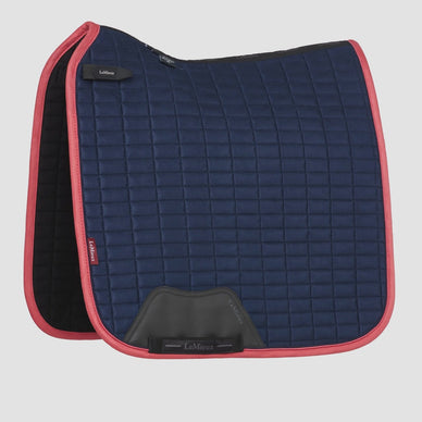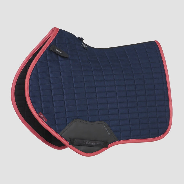 The Lemieux Suede saddle pad in Navy/Cranberry is the perfect blend of elegance and functionality. The rich navy blue color combined with a striking cranberry piping gives this pad an exclusive look that immediately catches the eye – ideal for those who like to look stylish at training or competitions.