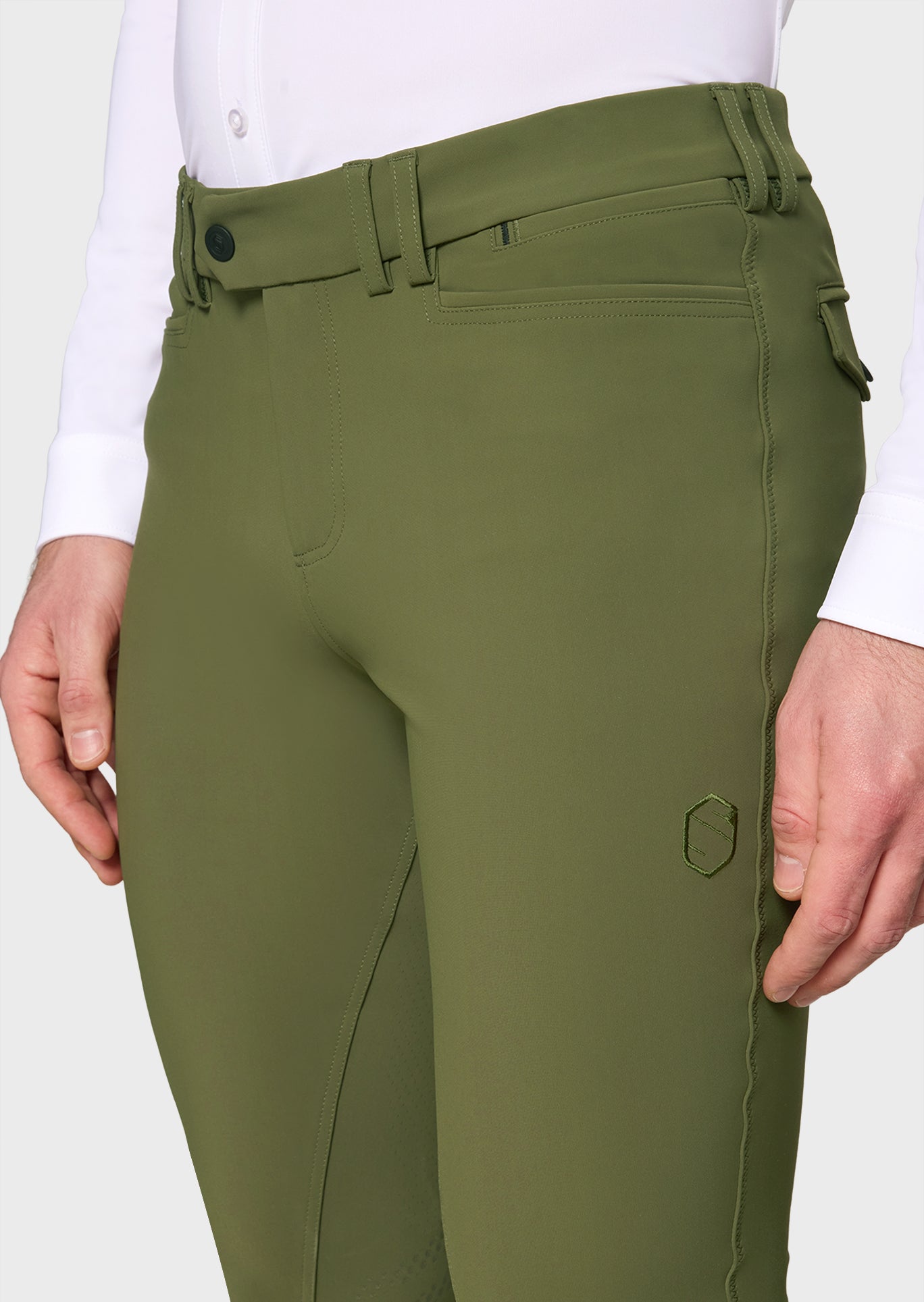 De full grip siliconen zit zorgt voor een stabiele en veilige positie in het zadel. Hierdoor behoud je meer controle en balans tijdens het rijden, zonder dat je bewegingsvrijheid beperkt wordt. De innovatieve technische stof is vierweg stretch, waardoor de rijbroek zich perfect aanpast aan het lichaam van de ruiter en elke beweging moeiteloos volgt.