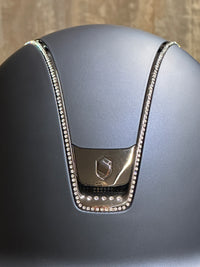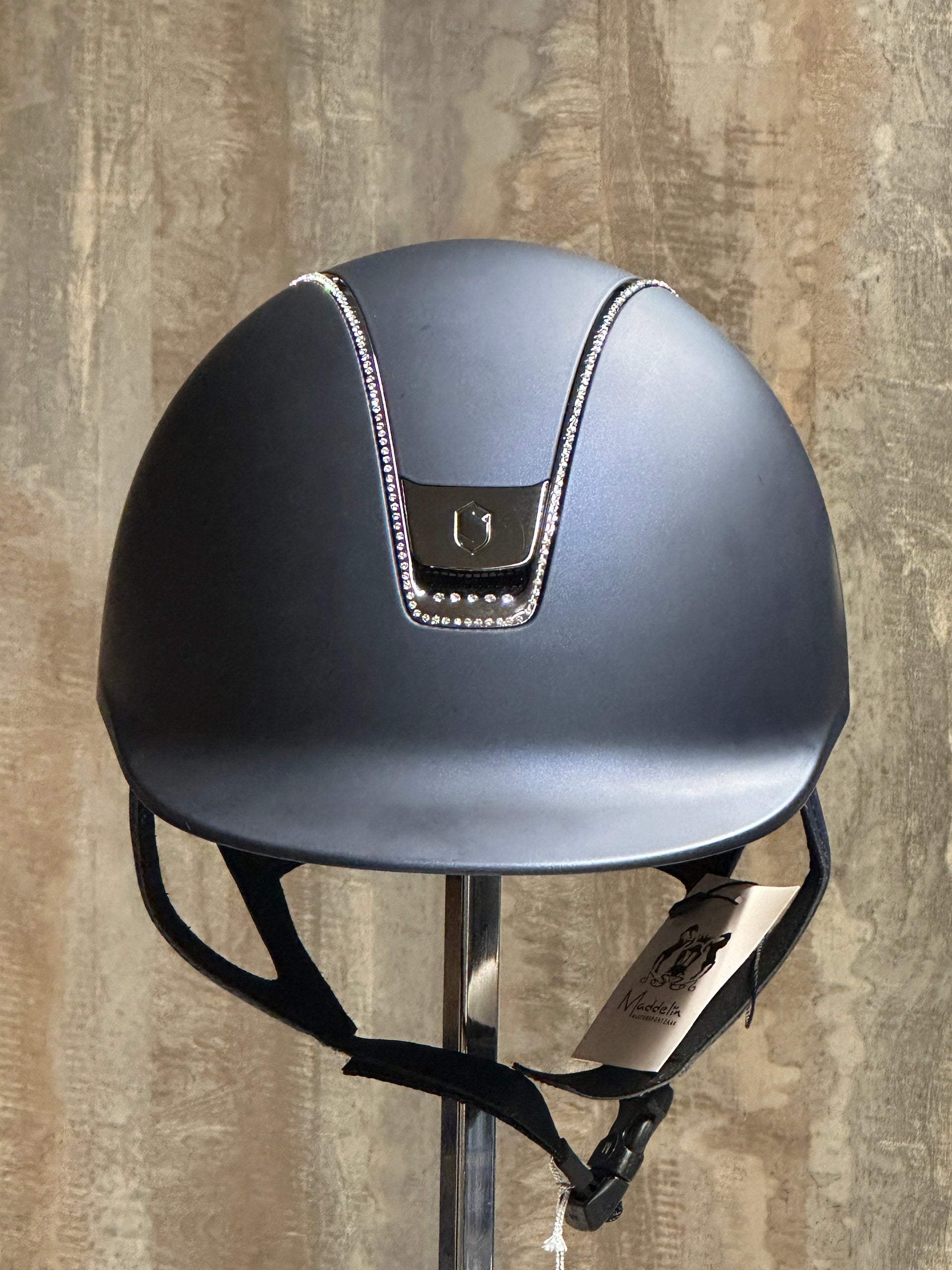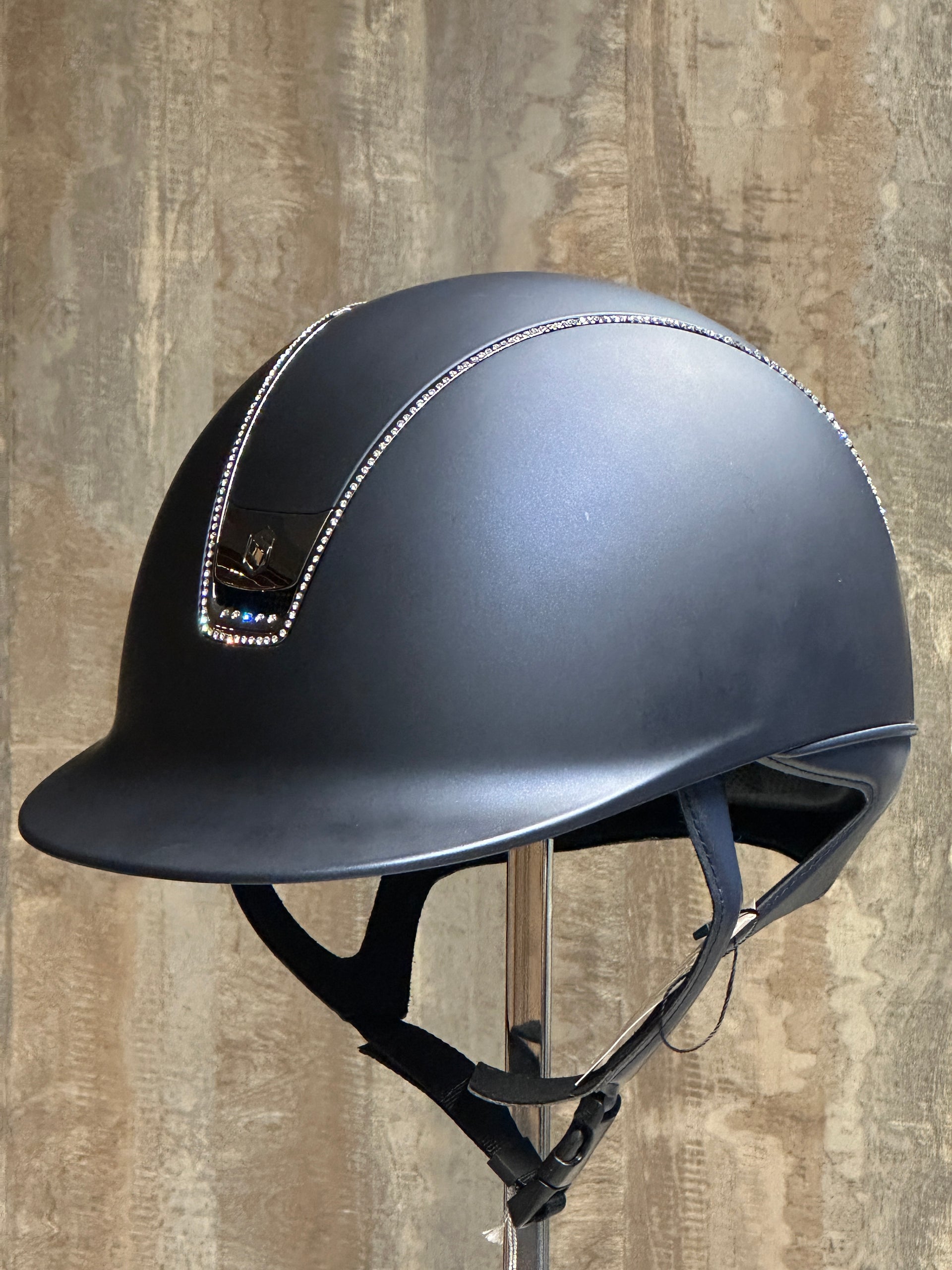 This helmet is the perfect choice for riders who want to stand out a little bit in the competition ring or at the stable. Elegant, technical, and comfortable. The combination of matte blue, black chrome details, and sparkling Swarovski crystals makes this helmet an absolute eye-catcher.