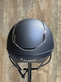 The Samshield Shadowmatt 2.0 in Blue with Chrome Black details and a full 300 Swarovski crystals is much more than a riding helmet. It's a statement of class, craftsmanship, and innovation. Designed for riders who want top performance with a luxurious look. Every detail has been refined – from the matte blue finish to the sparkling Swarovski crystals on the front, adorned with an impressive 300 original crystals .