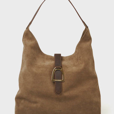 Ce sac TOT de luxe est l'accessoire indispensable des cavaliers qui apprécient le luxe, la simplicité et un design fonctionnel. Confectionné en daim souple de haute qualité, d'un chaleureux brun camel, et orné d'une boucle étrier dorée emblématique, ce sac spacieux et léger incarne l'élégance équestre.
