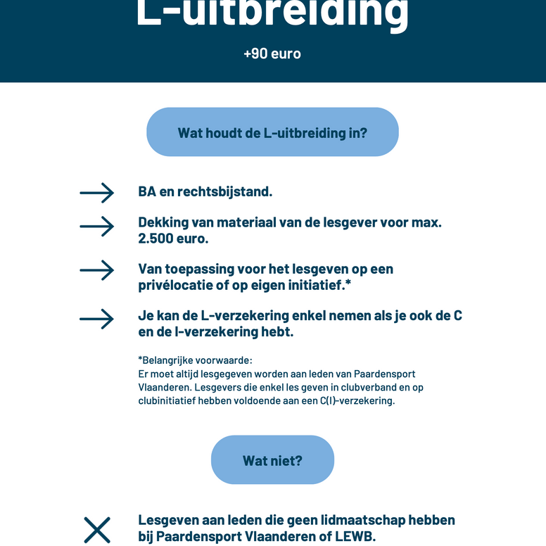 Important : Vous ne pouvez enseigner qu’aux cavaliers affiliés à Paardensport Vlaanderen ou à LEWB . Si vous travaillez exclusivement au sein du club, une assurance responsabilité civile professionnelle (RCP) est suffisante.