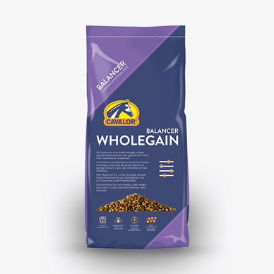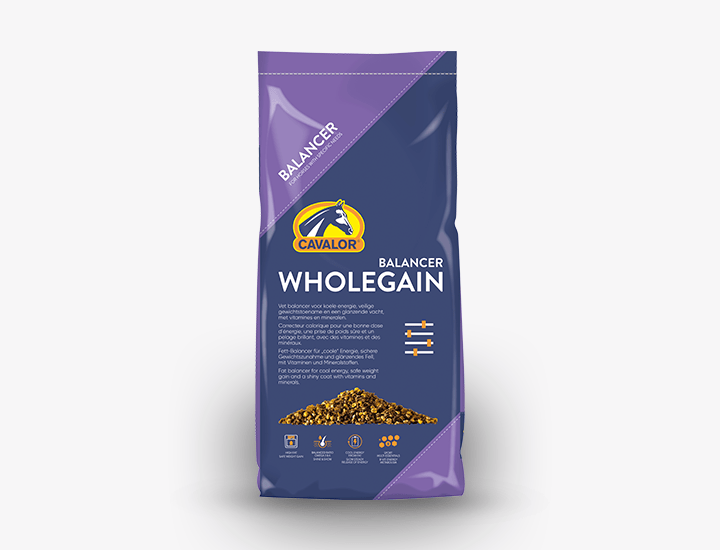 Composé de céréales extrudées, de soja grillé, d'huile de lin et de pulpe de betterave , Cavalor WholeGain est non seulement riche en énergie, mais aussi hautement digestible – doux pour l'estomac et facile à absorber.