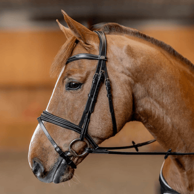La muserolle combinée est extra-largement rembourrée pour un confort optimal sur les zones sensibles de la tête du cheval. Les surpiqûres couleur crème lui confèrent une finition élégante et classique. Fournie avec des rênes souples en caoutchouc (16 mm) pour une meilleure prise en main.