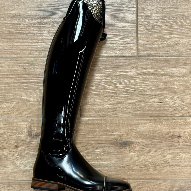 Cuir verni noir avec détails dorés — une icône de style au confort inégalé.