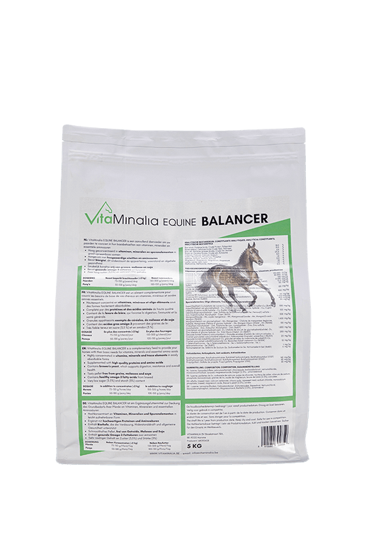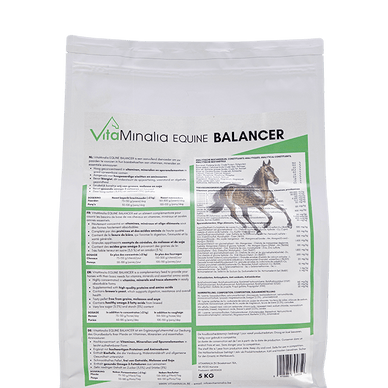 VitaMinalia Equine Balancer est un complément alimentaire quotidien de haute qualité, spécialement formulé pour combler les carences alimentaires du cheval et lui apporter toutes les vitamines, minéraux et oligo-éléments essentiels, sans agents de remplissage ni sucres superflus. Idéal pour les chevaux recevant peu d'aliments concentrés, sujets au surmenage ou nécessitant un soutien supplémentaire pendant l'entraînement, la récupération ou la mue.