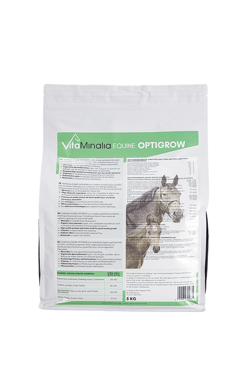 VitaMinalia Equine OptiGrow est un complément alimentaire soigneusement formulé pour favoriser la croissance et le développement sains des poulains, des jeunes chevaux et des chevaux de sport en développement. Sa formule est riche en minéraux essentiels, vitamines, acides aminés et antioxydants , qui contribuent ensemble à la solidité des os, à la souplesse des articulations et au développement musculaire harmonieux.