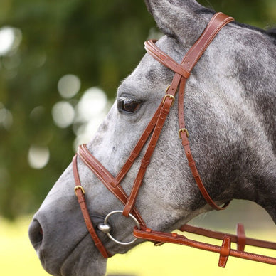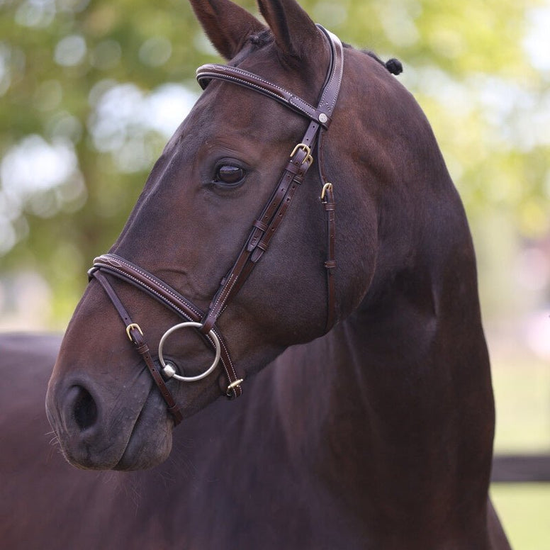 La têtière souple et ergonomique réduit la pression sur l'encolure, tandis que le frontal incurvé apporte une touche d'élégance et un confort accru. Grâce à son ajustement précis et à ses fermetures dissimulées , le bridon arbore une finition soignée et raffinée .