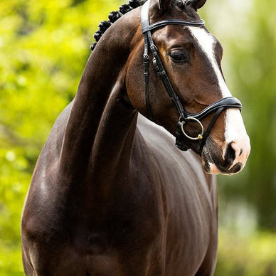 Le bridon est équipé d'une têtière anatomique de type K (réf. 189048), spécialement conçue pour soulager la pression sur les voies nerveuses sensibles . La muserolle est généreusement rembourrée , munie d'une protection souple pour la mâchoire et entièrement réglable. Des rabats de protection sous les boucles et les anneaux en D offrent un confort accru et préviennent les frottements.