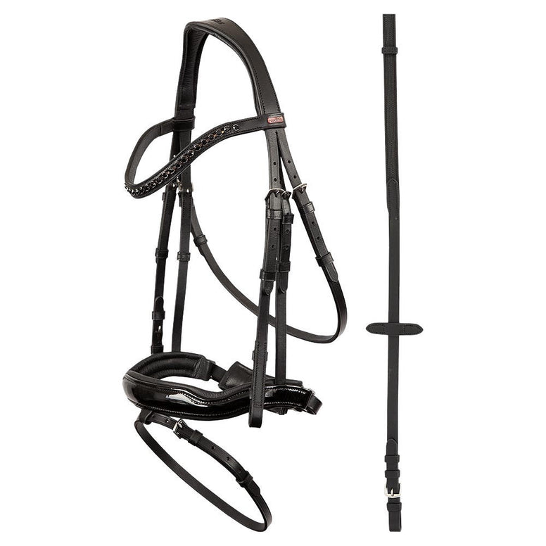 Le bridon Première Lorient Lacque offre à votre cheval un bridon anatomiquement correct au look luxueux – pour le confort et l'élégance en carrière.