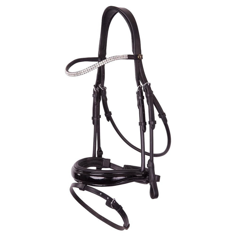 La têtière anatomique est rembourrée avec douceur et réduit la pression sur la nuque. Le frontal incurvé , subtilement orné de détails élégants, apporte une touche raffinée. La muserolle combinée , large et arrondie, assure une répartition uniforme de la pression et un maintien stable .