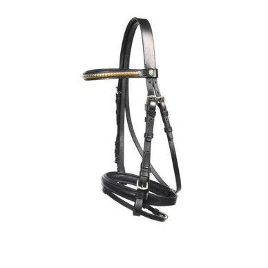 Le frontal subtilement orné de clous confère au bridon une allure élégante et moderne , tandis que la muserolle et la têtière rembourrées améliorent le confort du poney.