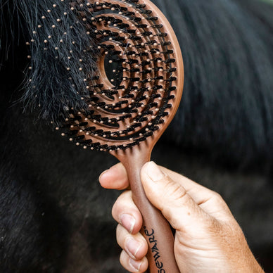 Le manche ergonomique à l'aspect bois offre une prise en main sûre et confère à la brosse une allure élégante, idéale pour les cavaliers souhaitant apporter une touche de style à leur routine de pansage. Légère et robuste, cette brosse deviendra vite votre alliée du quotidien, aussi bien à l'écurie qu'en compétition.