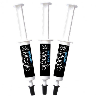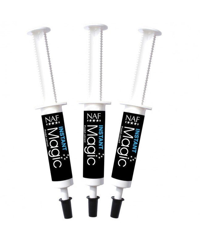 NAF Instant Magic est une pâte calmante puissante et naturelle, présentée en seringues orales pratiques, idéale pour les situations stressantes comme les compétitions, le transport, les visites du maréchal-ferrant ou les séances d'entraînement intenses. Ce lot de 3 seringues est parfait à avoir sous la main pour apaiser votre cheval sans l'endormir .