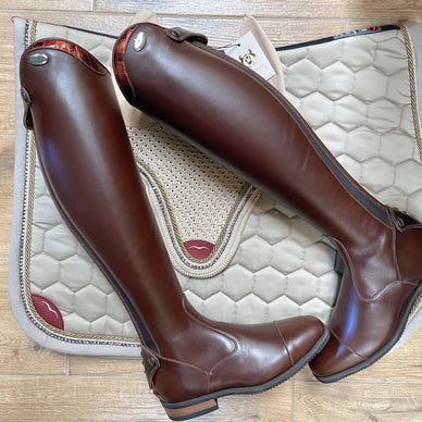 Cette botte DeNiro Italo/01 marron clair avec tige Luciwine attire tous les regards grâce à sa teinte bordeaux profonde et riche qui respire la puissance et l'élégance. Associée aux lignes épurées du modèle Italo, elle offre un style raffiné, parfaitement adapté aux exigences du cavalier de saut d'obstacles moderne.
