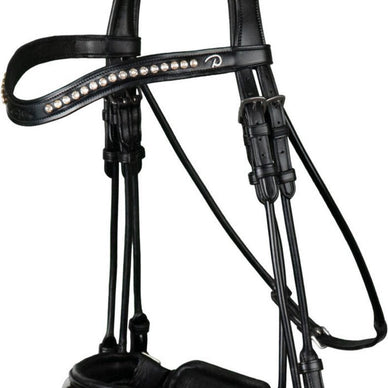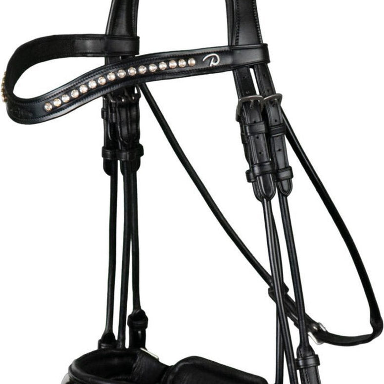 Le bridon double Dy'on, doté d'une large muserolle en cuir verni, est un chef-d'œuvre de la collection Dy'on Dressage. Ce bridon respire l'élégance et le savoir-faire. Le frontal souple en forme de V , richement orné de véritables cristaux Swarovski , capte la lumière à chaque foulée et confère à votre cheval une allure majestueuse.