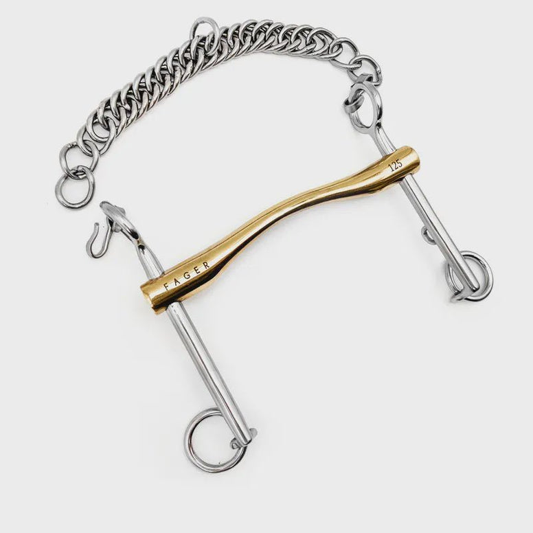 Le mors Fager Lincoln est doté du matériau innovant Sweet Gold™ , un alliage de cuivre intelligent qui offre non seulement un goût agréable, mais favorise également l'acceptation et la détente. Associé à une conception ergonomique et à une action douce des barres, ce mors réunit tous les éléments pour une communication harmonieuse entre le cavalier et le cheval.