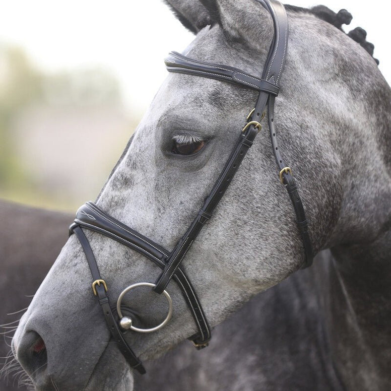 La têtière souple et ergonomique réduit la pression sur l'encolure, tandis que le frontal incurvé apporte une touche d'élégance et un confort accru. Grâce à son ajustement précis et à ses fermetures dissimulées , le bridon arbore une finition soignée et raffinée .