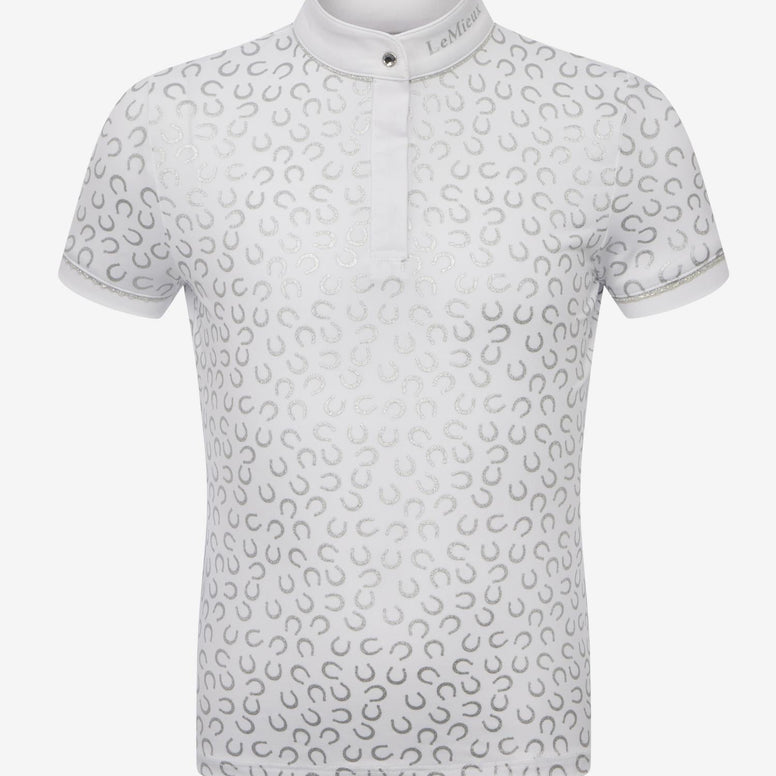 Laissez votre jeune cavalier briller dans ce polo de concours de haute qualité, confortable et élégant ! Parfait pour sa première compétition, avec une finition soignée qui lui donnera une allure assurée. Choisissez entre le blanc classique orné d'un imprimé fer à cheval scintillant ou le ravissant rose poudré pour un look chic et ludique.