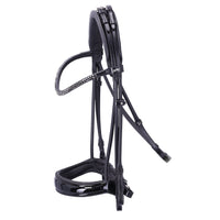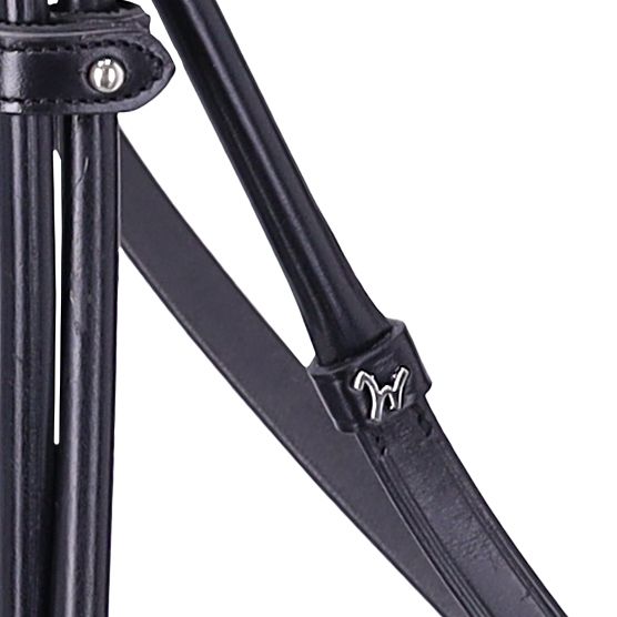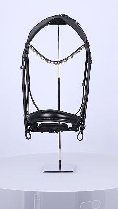 La muserolle préformée épouse les proportions naturelles de la tête et assure un contact stable et confortable. Le frontal étroit est élégamment orné de deux rangées de cristaux, créant un style raffiné et sportif sans ostentation. Les anneaux en D souples et intégrés aux montants renforcent la stabilité du bridon pendant son utilisation. Ce bridon est fourni avec une luxueuse housse en velours pour le protéger et le garder propre lors des compétitions ou des déplacements.