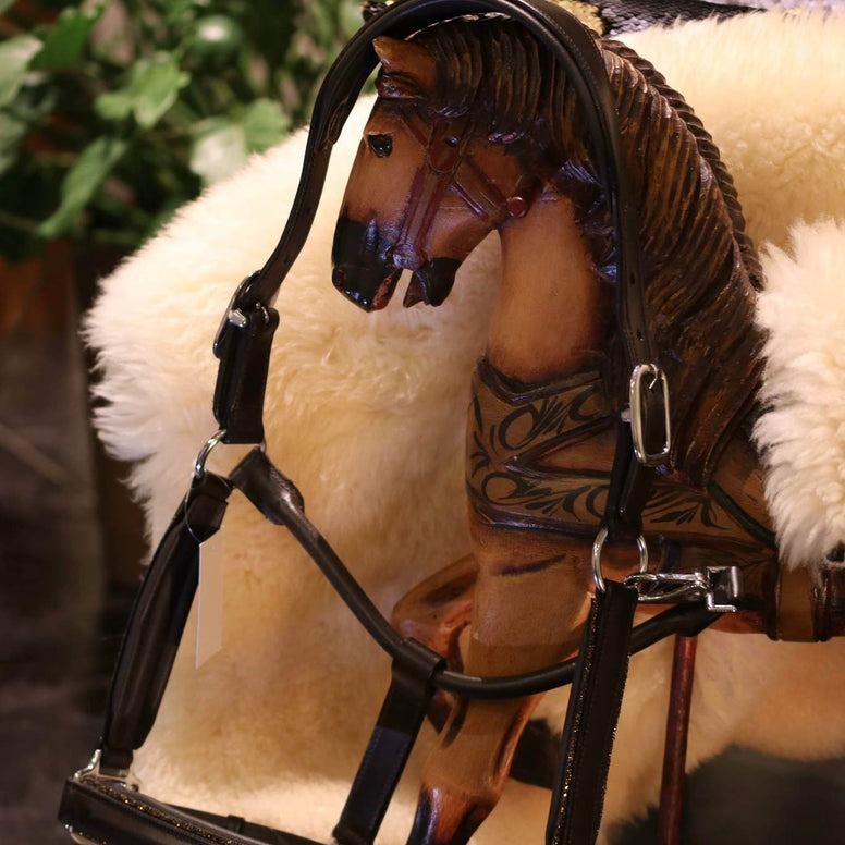 Licol anatomique en cuir luxueux de la collection Show-Time. Orné de pierres scintillantes sur la muserolle et les montants. Double réglage à l'arrière grâce à la têtière et à la muserolle, et fermeture par mousqueton. Rembourrage souple en cuir à divers endroits. Les pierres ne sont pas garanties.