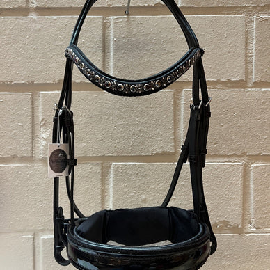 Le mors JUDI Crystal Fabric Black Traverso Snaffle en argent métallisé et hématite de jais incarne l'élégance et le savoir-faire. Son design unique, orné de cristaux Swarovski scintillants et de cuir verni brillant, lui confère une allure exclusive, idéale pour le dressage, les présentations ou les compétitions où le style est primordial.
