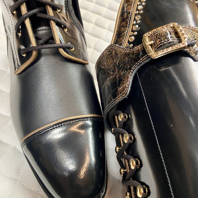 Cette botte respire l'élégance, sur la piste comme en dehors. Que vous soyez un cavalier de compétition ambitieux ou un entraîneur exigeant, la Tintoretto Brushed Black, avec son empeigne Rodine Lucifumoro et ses cristaux Swarovski, apportera une touche de style incomparable.