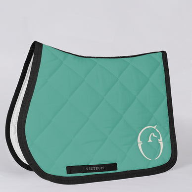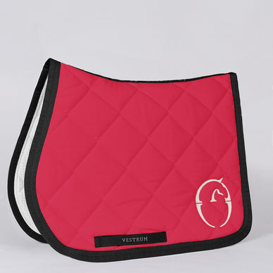 De randen zijn afgewerkt met tonale of contrasterende biezen voor een verfijnde look en het Vestrum-logo (borduursel en logo-tape op de zijkanten) geeft het een subtiele, professionele uitstraling. Of je nu traint of deelneemt aan springsessies, dit zadeldek ondersteunt je paard op technisch en visueel topniveau.