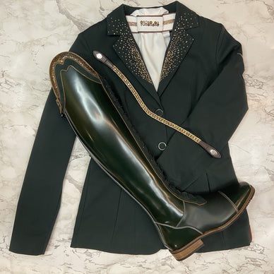La botte d'équitation DeNiro Volta, en cuir vert brossé unique et dotée de la technologie Top Rondine Galagld011, attire tous les regards en carrière. Alliant modernité et technicité, elle est spécialement conçue pour les cavaliers de dressage ambitieux.