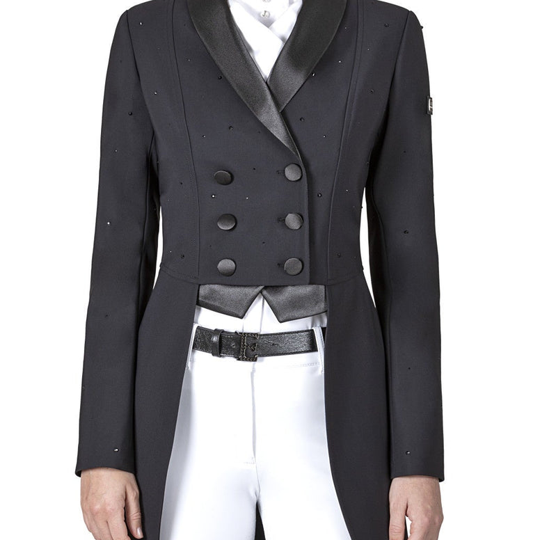 La veste est délicatement ornée de cristaux noirs sur le haut du dos, le devant et les manches, ainsi que de détails en satin sur le col et les boutons . L'ensemble confère à la queue-de-pie une allure élégante et féminine, rehaussée d'une touche d'éclat.