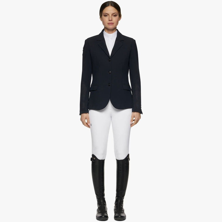 Deze klassieke wedstrijdjas voor dames van Cavalleria Toscana is dé perfecte mix van Italiaanse stijl en technische innovatie. Gemaakt van een lichtgewicht, geperforeerde 4-way stretch jersey, die zich soepel aanpast aan je bewegingen in het zadel – zonder in te leveren op uitstraling of comfort. Ideaal voor de moderne amazone die topprestaties wil combineren met verfijnde elegantie.