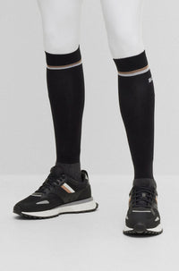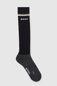 De hoge schacht zorgt ervoor dat je sokken netjes op hun plaats blijven tijdens het rijden, terwijl de verstevigde zones onder de voet extra ondersteuning en duurzaamheid bieden. Dankzij het subtiele design en de stijlvolle BOSS-branding voeg je een vleugje luxe toe aan je dagelijkse trainingsoutfit — zonder in te boeten op functionaliteit.