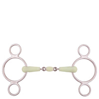 Het dubbel gebroken mondstuk met Apple Mouth coating zorgt voor een aangename smaak en extra acceptatie bij gevoelige paarden. Het zachte synthetische materiaal stimuleert speekselaanmaak, waardoor het paard het bit beter aanneemt en ontspant in de kaak. De afgeronde afwerking en anatomische vorm volgen de contouren van de paardenmond voor een gelijkmatige drukverdeling.