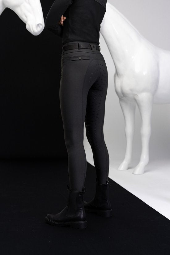 De hoge taille met extra brede band en drievoudige sluiting biedt ondersteuning en geeft een prachtig gestroomlijnd silhouet. Het fullgrip zitvlak met PA-siliconenprint zorgt voor maximale stabiliteit in het zadel, zonder je bewegingsvrijheid te beperken — ideaal voor intensieve dressuur-, spring- of trainingssessies.