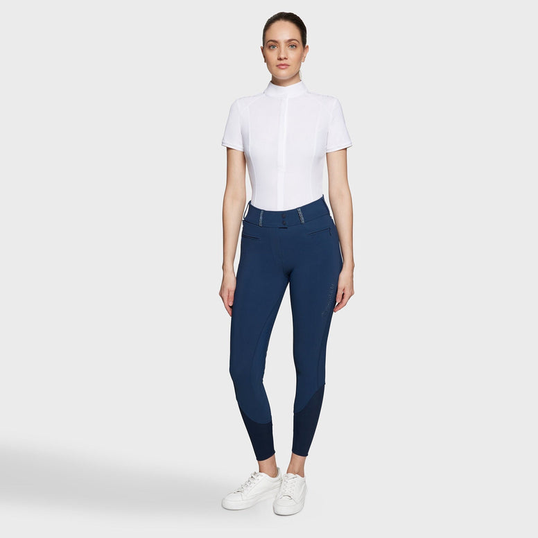 De Samshield Claranova rijbroek is de ultieme combinatie van stijl, comfort en prestatie. Met een verfijnd Swarovski®-logo op de dij en subtiele kristaldetails op de zakken en tailleband, straalt deze rijbroek pure luxe uit.