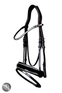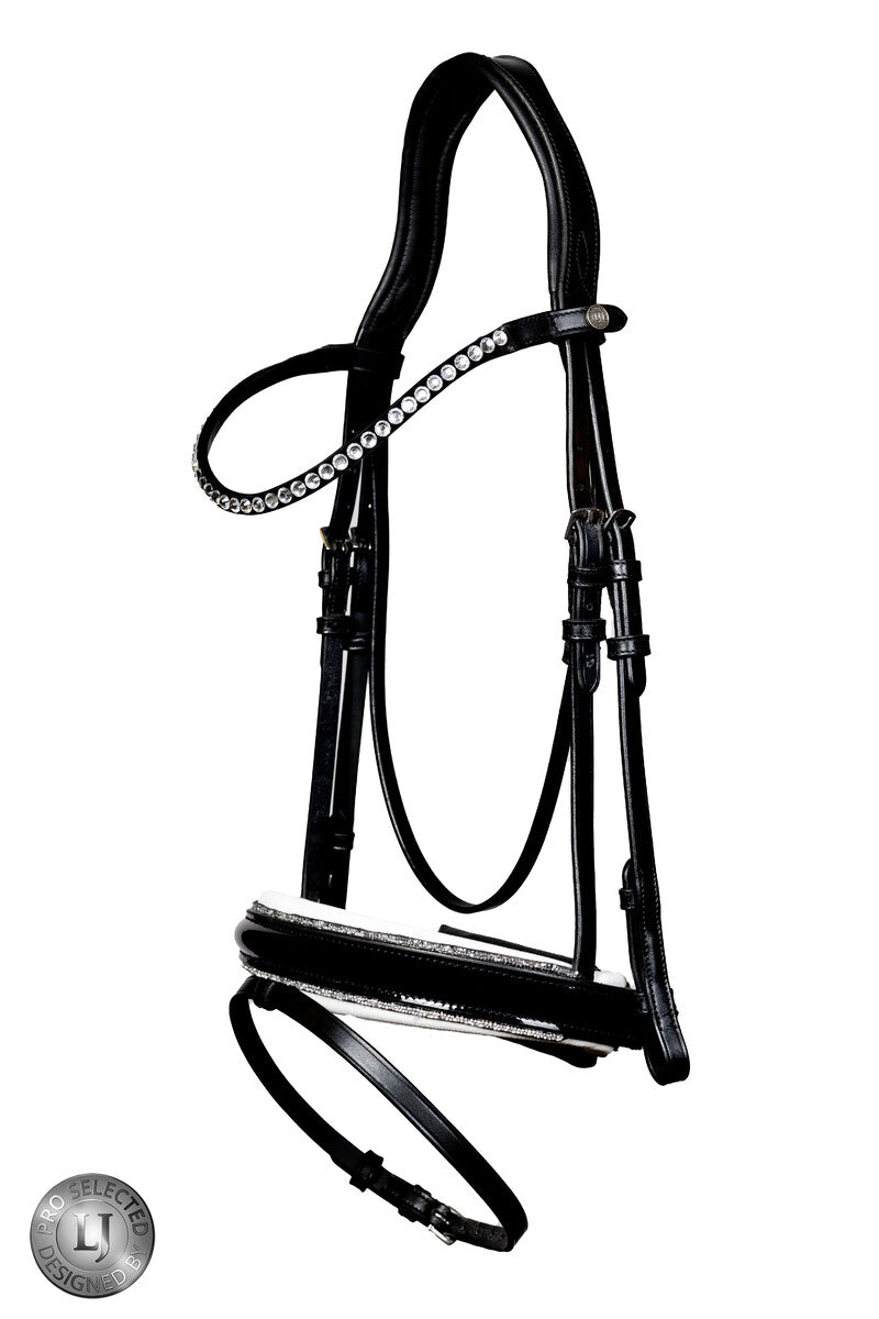 De prachtige lakneusriem is afgewerkt met een zilveren “rock piping”, die een subtiel sprankelend effect geeft. Dankzij de zachte polstering heeft de neusriem een drukverlagende werking, terwijl de kinbeschermer zonder stiksels irritaties voorkomt. De aansnoerriem is zo geplaatst dat deze de huid niet kan beschadigen.