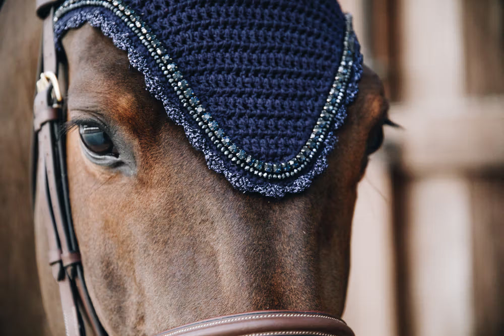 Dankzij de soundless oren, gemaakt van een meerlagige stof die geluid absorbeert, blijft je paard kalm en gefocust, zelfs in rumoerige situaties. De lange snit aan de voorkant zorgt voor een perfecte ligging onder het hoofdstel, terwijl het handgemaakte gehaakte katoen garant staat voor ademend comfort en een luxueuze uitstraling.