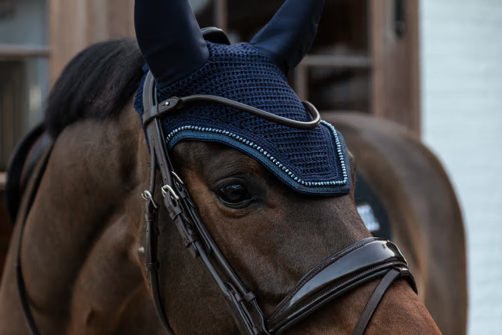 Gemaakt van handgehaakt katoen en uitgerust met elastische, licht geluiddempende oren, zorgt dit oornetje voor extra rust en concentratie bij je paard, of je nu traint of in de wedstrijdring staat. De langere snit vooraan helpt het oornetje mooi op zijn plaats te houden onder het hoofdstel.
