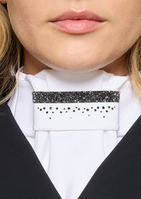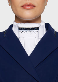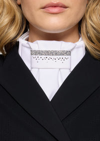 Het Premium Rain model wordt gekenmerkt door verfijnde kristallen details die een subtiele schittering creëren wanneer ze het licht opvangen. Deze elegante accenten geven de plastron een exclusieve uitstraling zonder overdreven te zijn. Hierdoor past hij perfect bij verschillende wedstrijdjasjes en shirts en is hij geschikt voor zowel dressuur- als springruiters die hun outfit willen verfijnen.