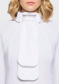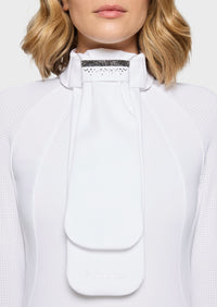 Dankzij het praktische ontwerp is de plastron eenvoudig te bevestigen en blijft hij netjes op zijn plaats tijdens het rijden. Zo kun jij je volledig focussen op je prestatie, terwijl je wedstrijdoutfit tot in de details verzorgd is.