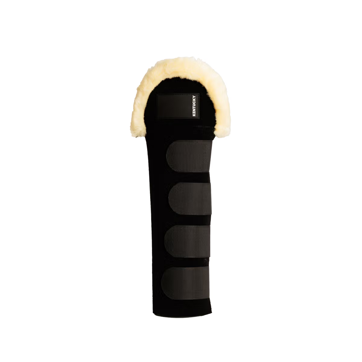 De binnenzijde is volledig gevoerd met Kentucky’s kenmerkende vegan sheepskin, dat wrijving en schuurplekken voorkomt – ideaal voor geschoren paarden of lange transporten. Dankzij de stevige, verstelbare klittenbandsluitingen blijft de beschermer goed op z’n plaats zonder te knellen of af te zakken.