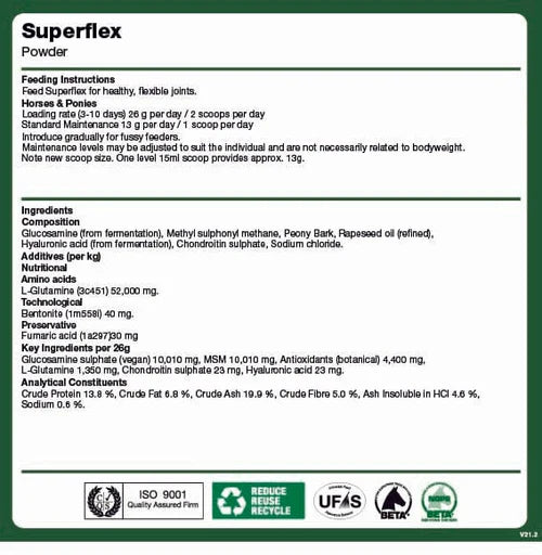 NAF Superflex Poeder 800g is een hoogwaardig supplement voor paarden die extra ondersteuning nodig hebben bij hun gewrichten – van sportpaarden tot oudere paarden die soepel willen blijven bewegen. Deze krachtige formule bevat een wetenschappelijk gebalanceerde mix van glucosamine, chondroïtine, MSM, hyaluronzuur en antioxidanten – ideaal voor dagelijks onderhoud én preventieve inzet.