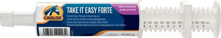 Cavalor Take It Easy Forte is een krachtige kalmerende pasta voor paarden in stressvolle situaties zoals wedstrijden, transport of drukke omgevingen. Dankzij de hoge dosering L-tryptofaan, B-vitamines en magnesium helpt deze pasta snel en effectief bij het verminderen van spanning en bevordert het focus en ontspanning. In handige orale spuit voor een vlotte toediening.