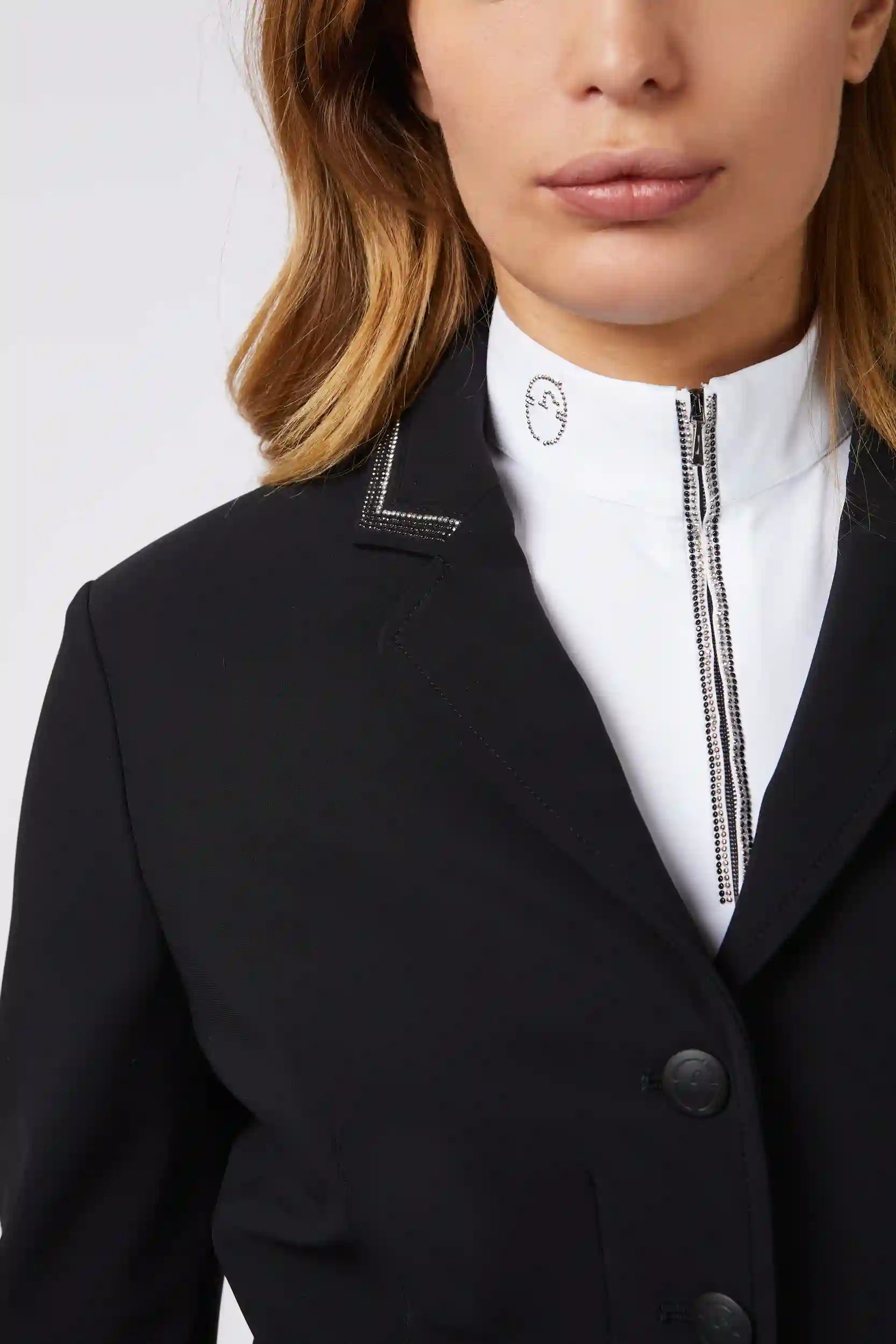 De Nizza jacket kenmerkt zich door een elegante, vrouwelijke snit die het silhouet flatteert zonder aan sportiviteit te verliezen. Subtiele Vestrum-details en verfijnde afwerking geven de jas een luxueuze uitstraling die onmiddellijk professioneel oogt in de ring. Dit is een wedstrijdjas voor amazones die klasse willen uitstralen en zich volledig willen focussen op hun prestatie.