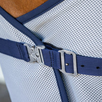 Deze vliegendeken onderscheidt zich door zijn innovatieve materiaalkeuze en doordachte pasvorm. De stof is licht, ademend en tegelijkertijd duurzaam, waardoor je paard koel blijft, zelfs op warme zomerdagen. Dankzij de ergonomische snit sluit de deken mooi aan op het lichaam zonder te schuren of te verschuiven, wat essentieel is voor paarden die veel bewegen op de weide of paddock.