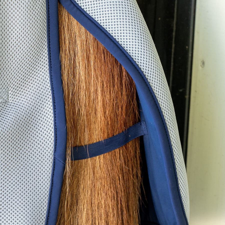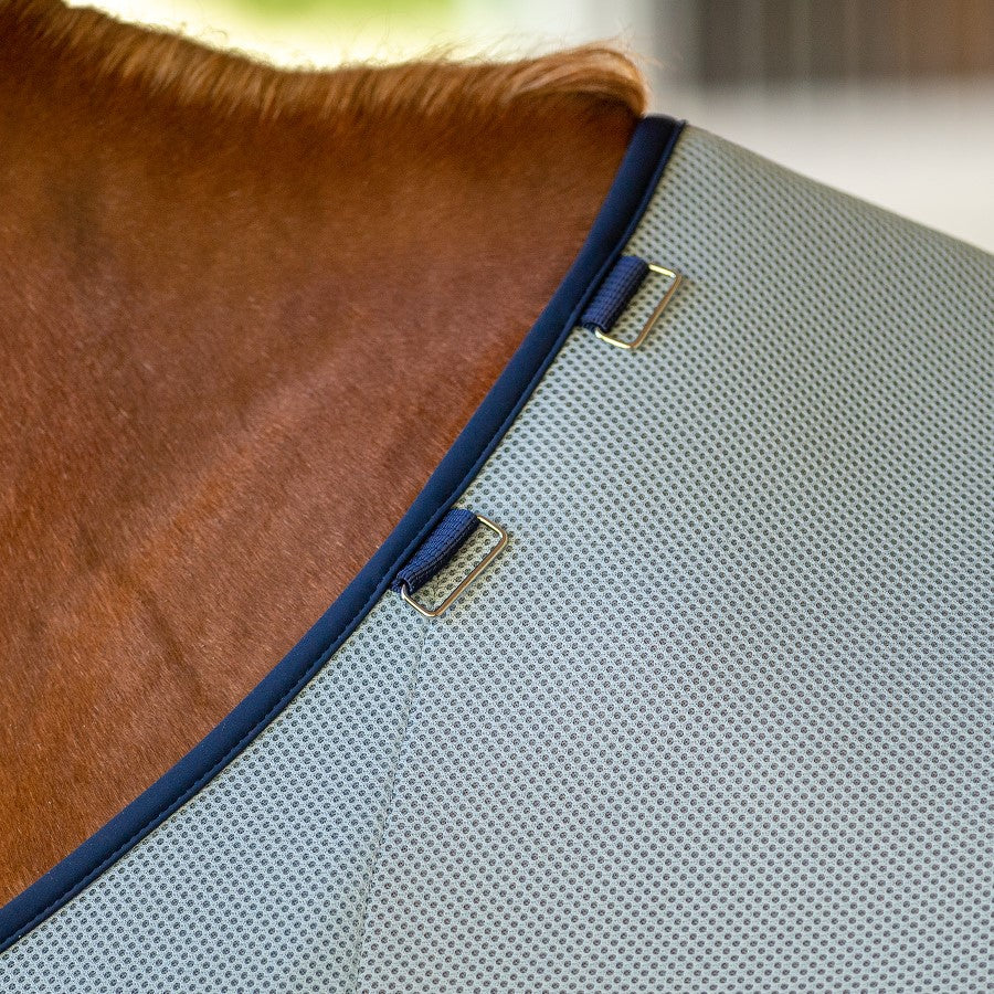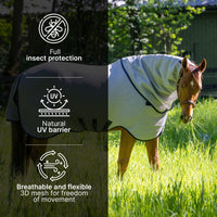 Wat deze deken echt uniek maakt, is de combinatie van bescherming en comfort. De fijne structuur van de stof vormt een barrière tegen insecten, terwijl de ventilatie behouden blijft. Hierdoor voorkom je stress, huidirritaties en onrust bij je paard. Ideaal voor gevoelige paarden of paarden die snel reageren op insectenbeten.