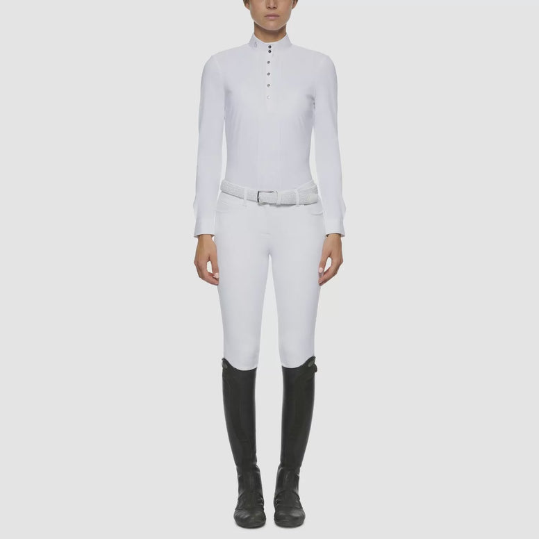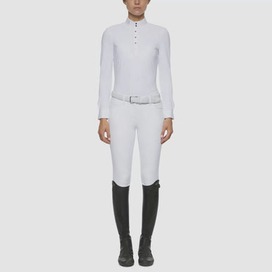 Dit technische wedstrijdshirt van Cavalleria Toscana is speciaal ontworpen voor amazones die tijdens de wedstrijd willen presteren met stijl, comfort én bewegingsvrijheid. Gemaakt van 4-way stretch jersey, sluit het shirt perfect aan op het lichaam zonder te knellen, en volgt het elke beweging in het zadel – van opwarming tot laatste lijn.